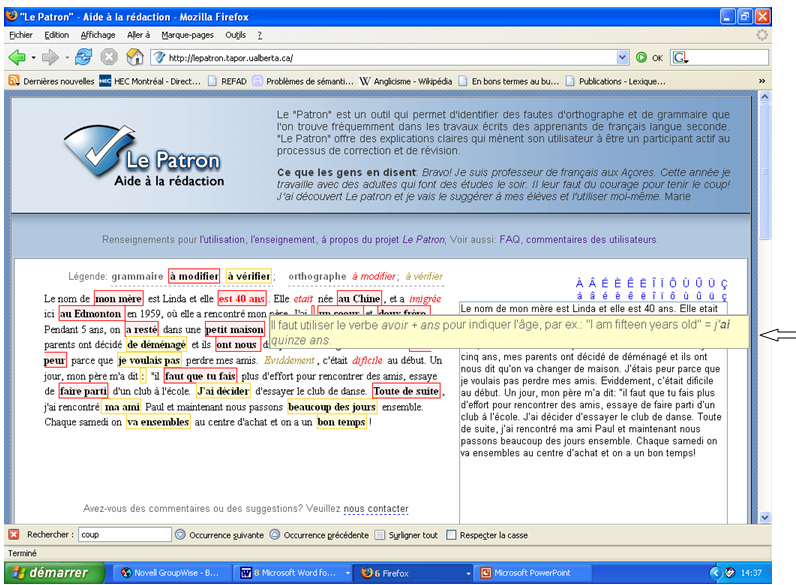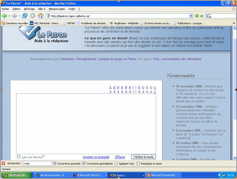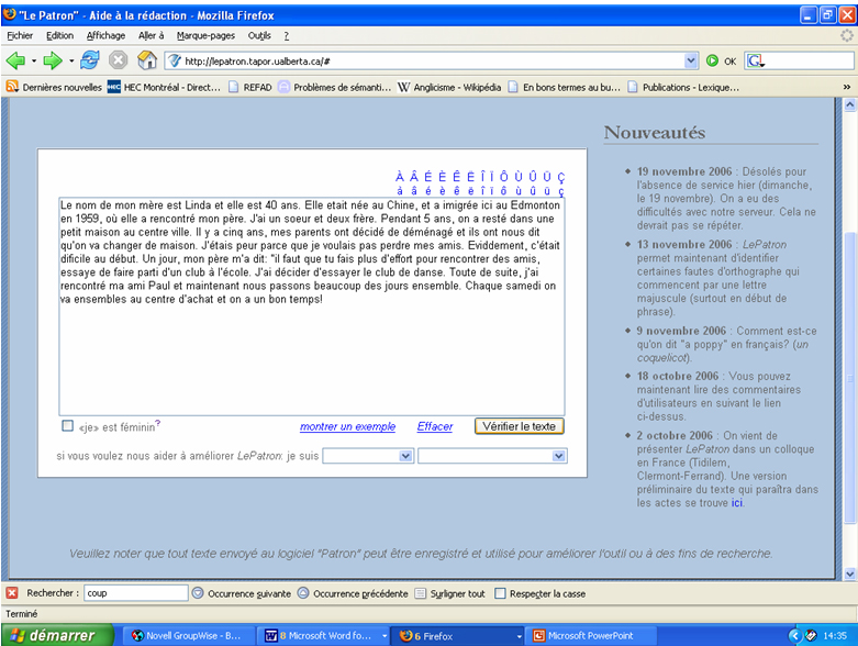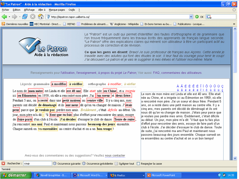Vous n’avez pas de correcteur, vous ne savez pas comment l’utiliser, il est mal configuré…Le site lepatron.ca est une ressource supplémentaire qui peut compléter le travail du correcteur intégré de votre traitement de texte. Gardez bien en tête qu’il s’agit d’un outil intéressant, mais qui n’est pas infaillible.